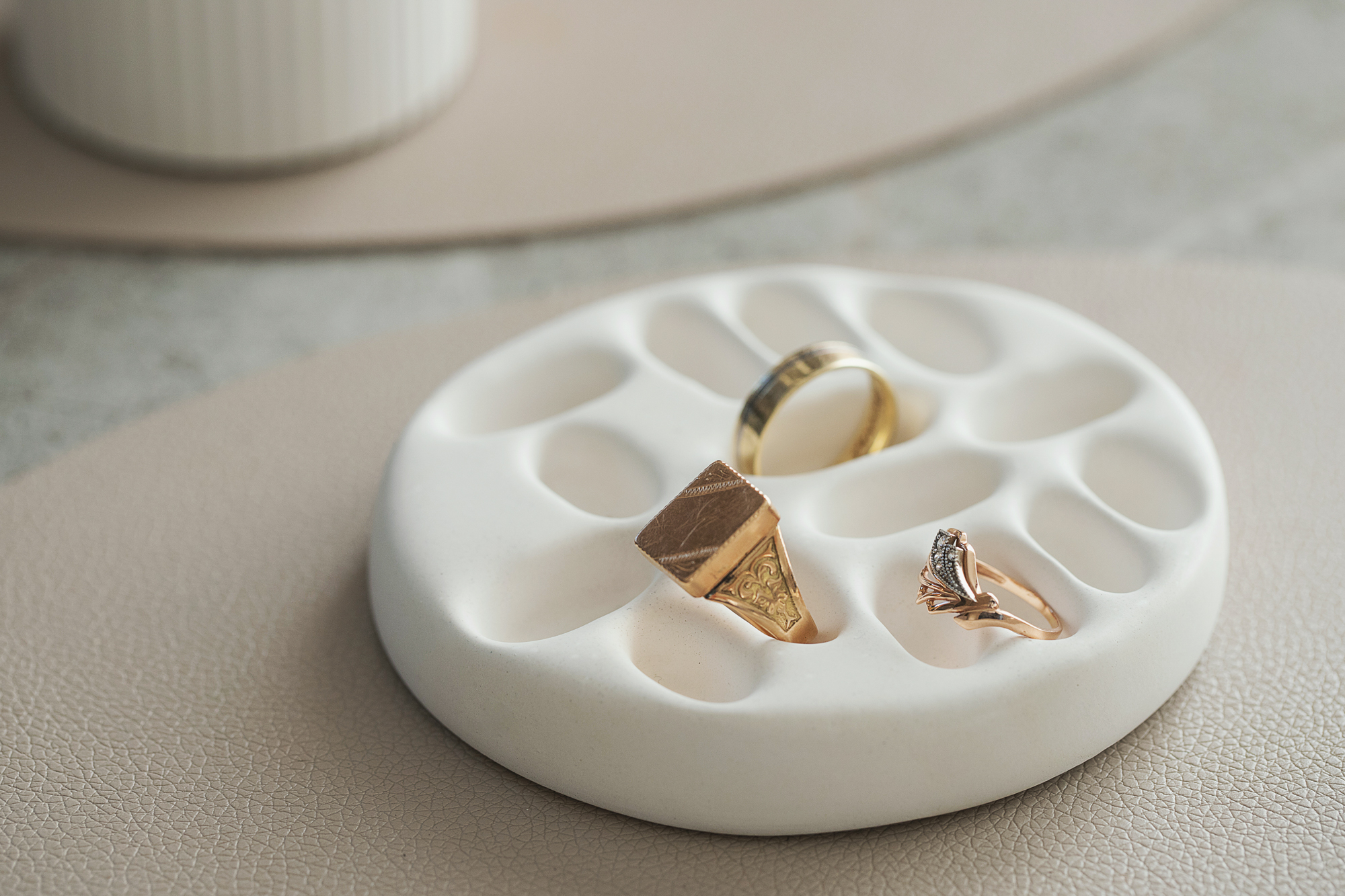 Laikykite savo mėgstamus žiedus tvarkingus ir gražiai, naudodami mūsų apvalų žiedų patiekalą. Šis minimalistinis papuošalų padėklas skirtas paprastai ir elegantiškai laikyti ir demonstruoti jūsų žiedus. Nesvarbu, ar ant naktinio staliuko, komodos ar vonios stalviršio, šis žiedų laikiklis suteikia erdvei stilingumo, o papuošalai bus pasiekiami.